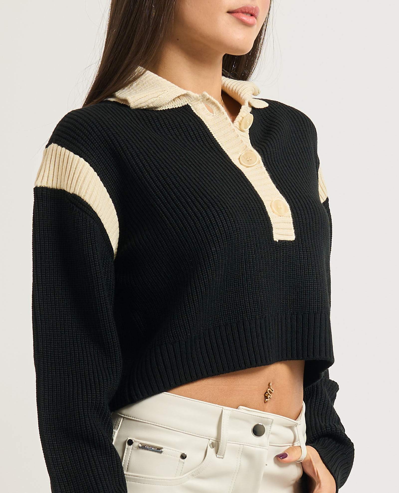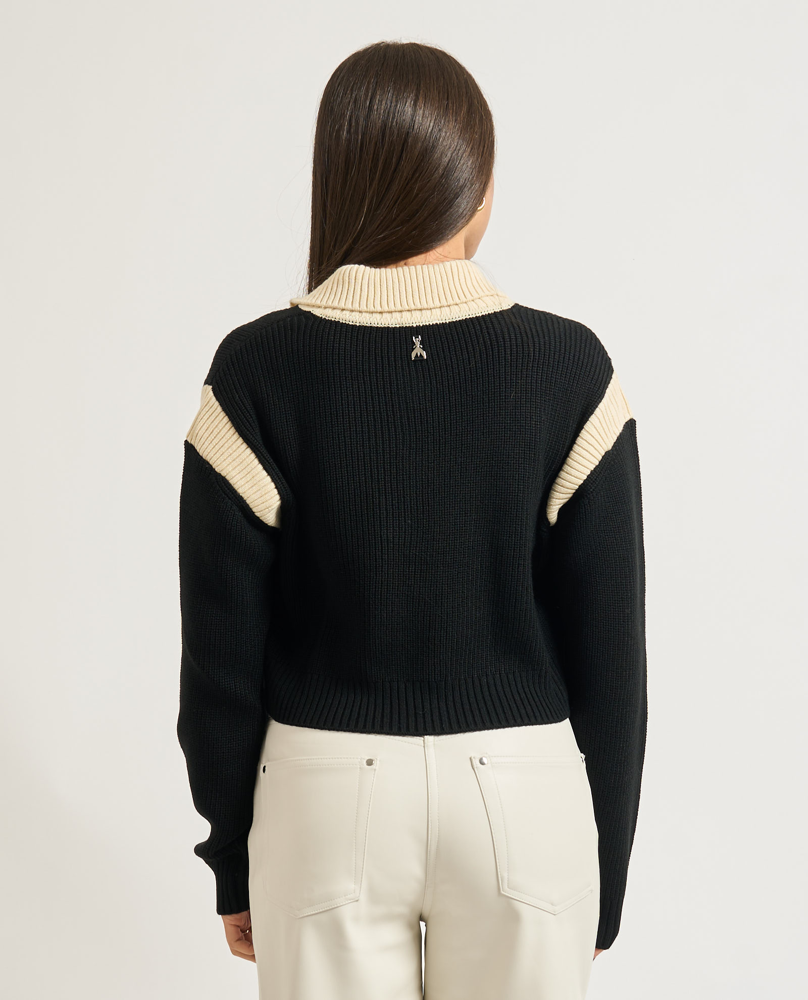 Maglia per donna firmata Patrizia Pepe della capsule Racing realizzata in misto lana. Colletto a polo, fantasia color block, lavorazione in costa inglese. Vestibilità morbida. La modella indossa una S ed è alta 1.65m