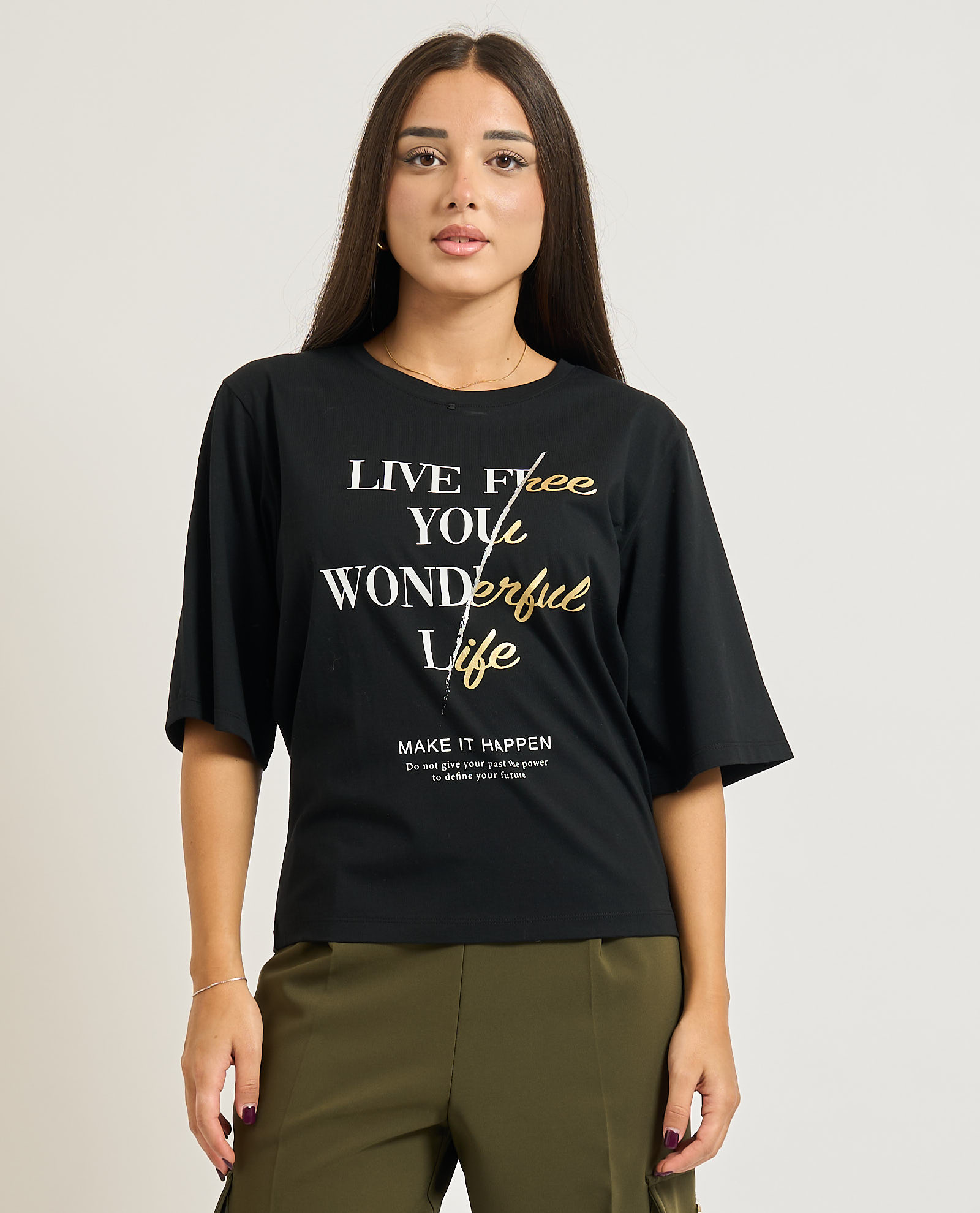 T-shirt donna Relish modello mezza manica con collo tondo con catena, placca con logo e stampa frontale.