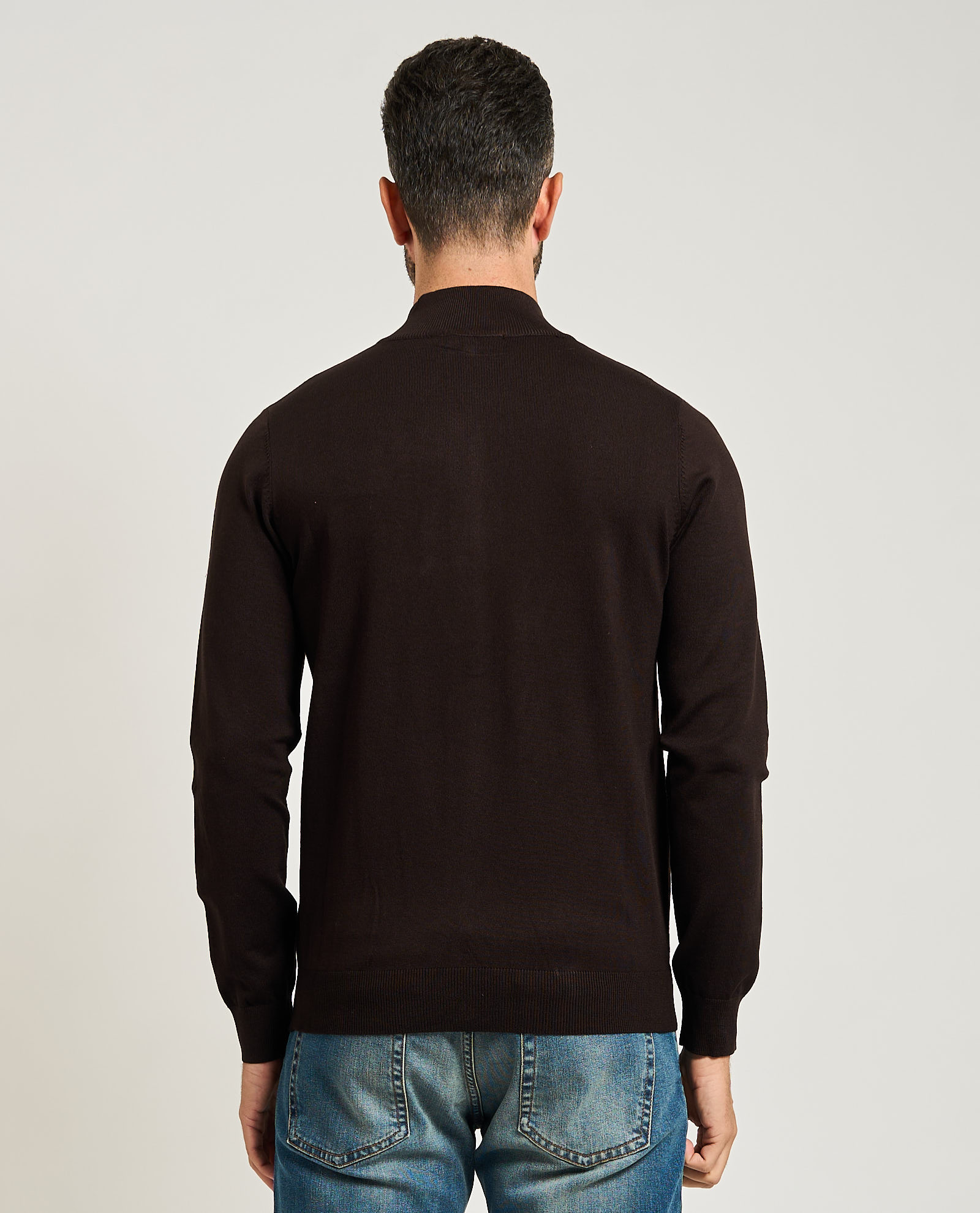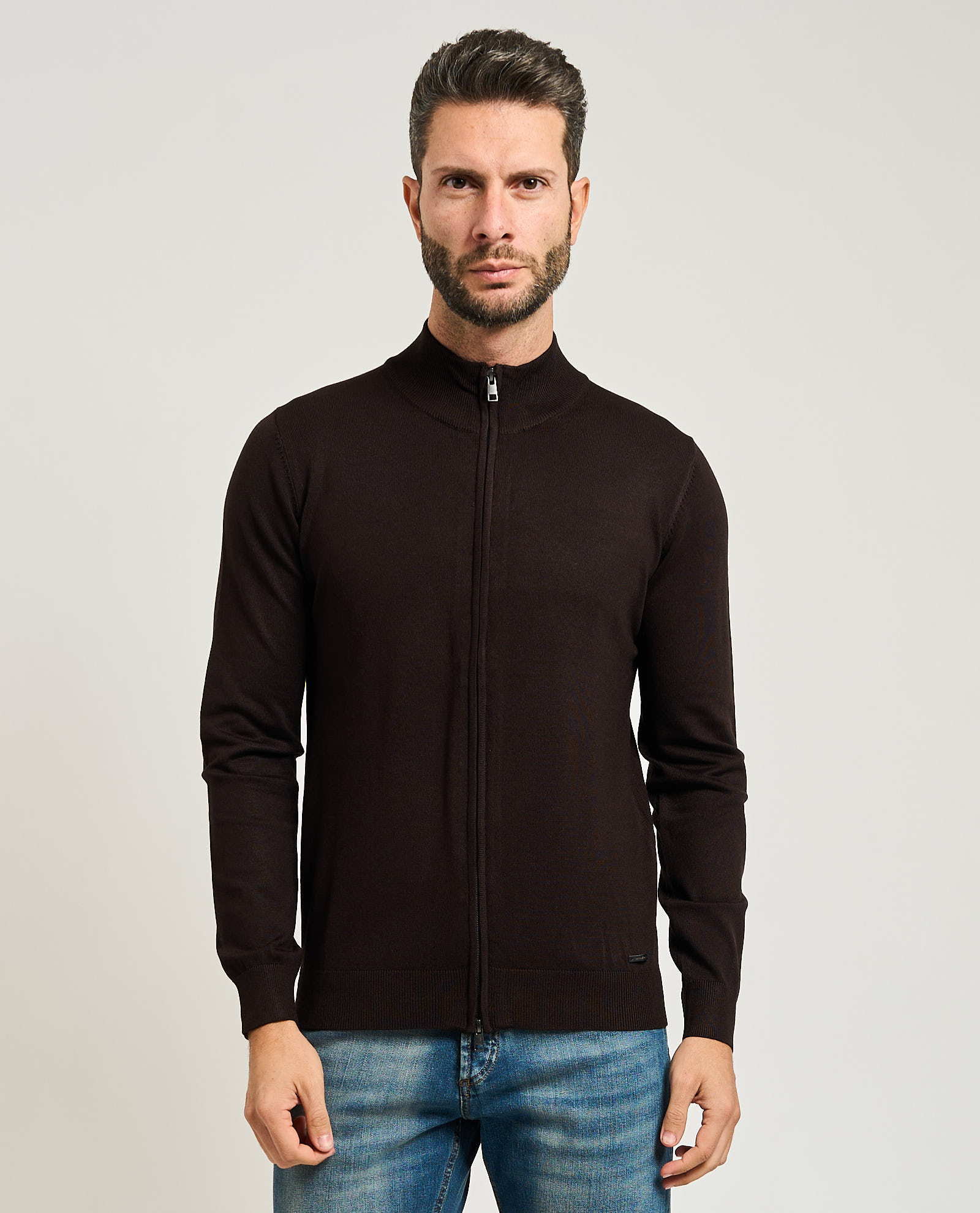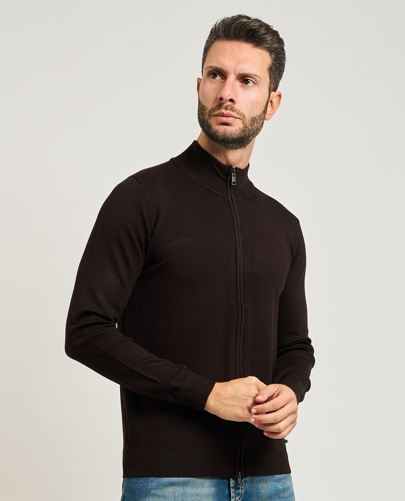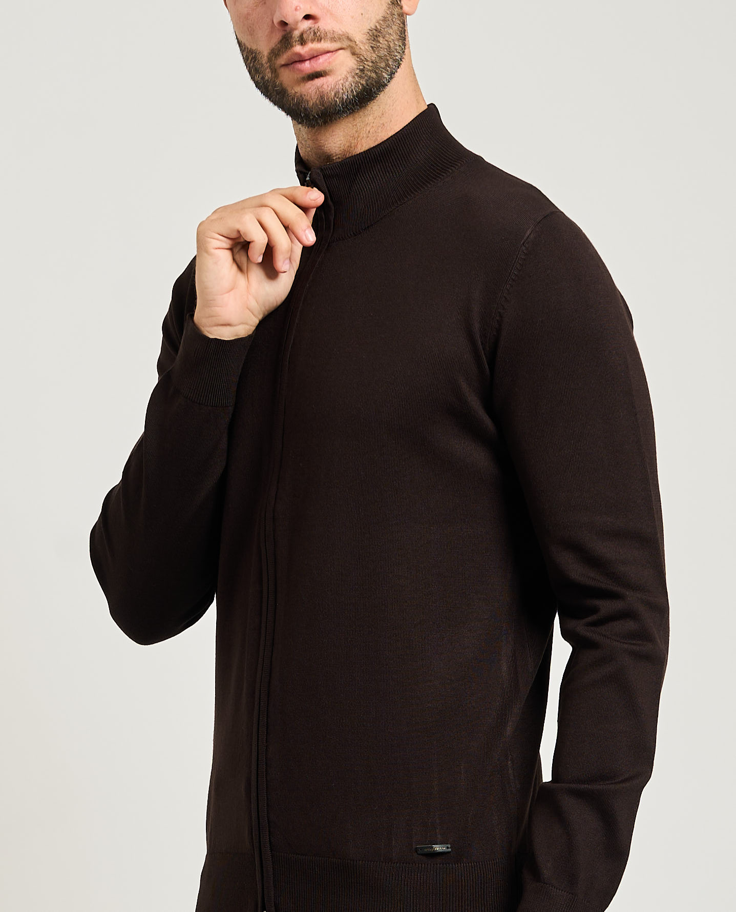 Cardigan da uomo firmato Sette/mezzo, fullzip, maniche lunghe, costine sugli orli, narrow fit, tinta unita. Il modello indossa una M ed è alto 1.85m