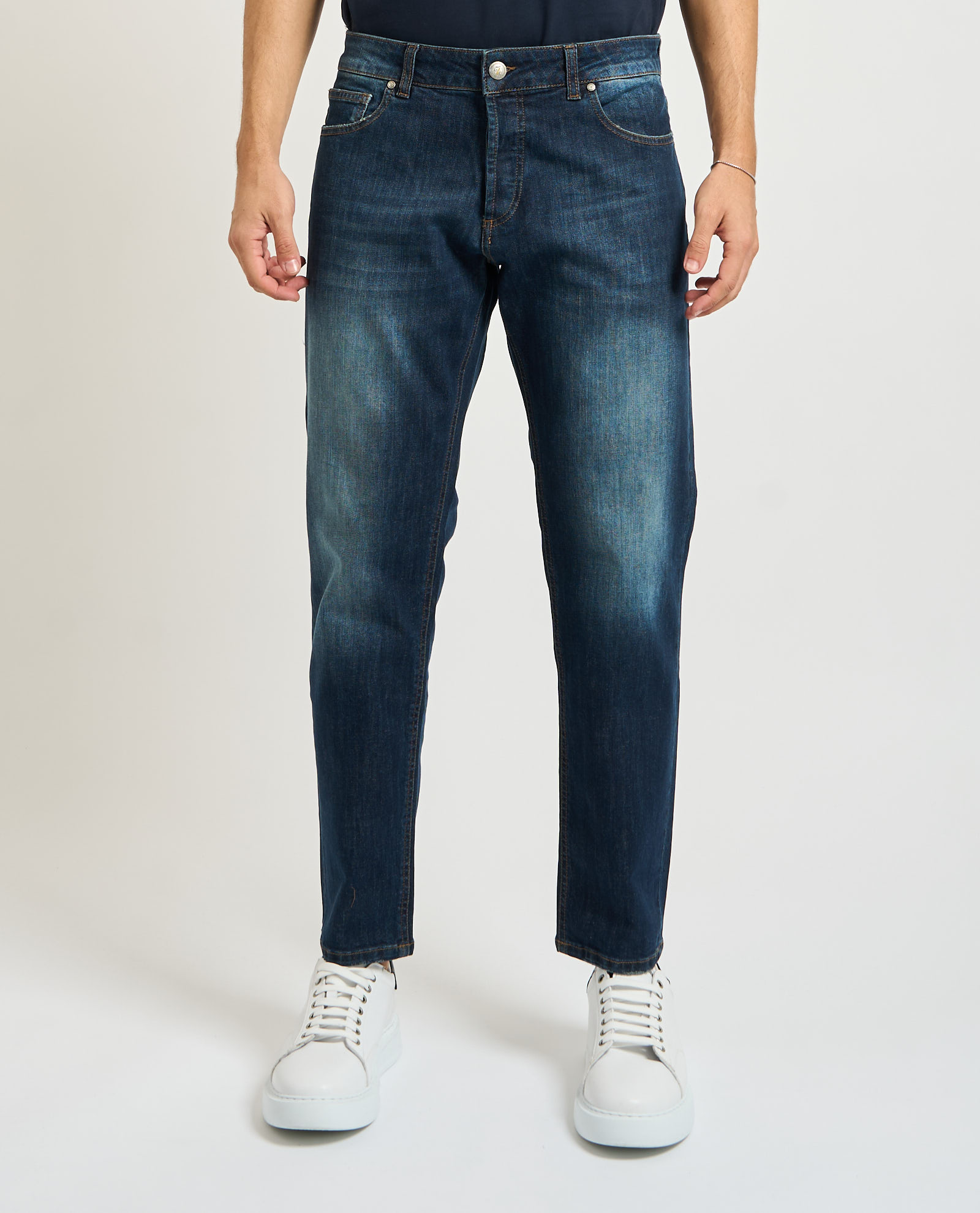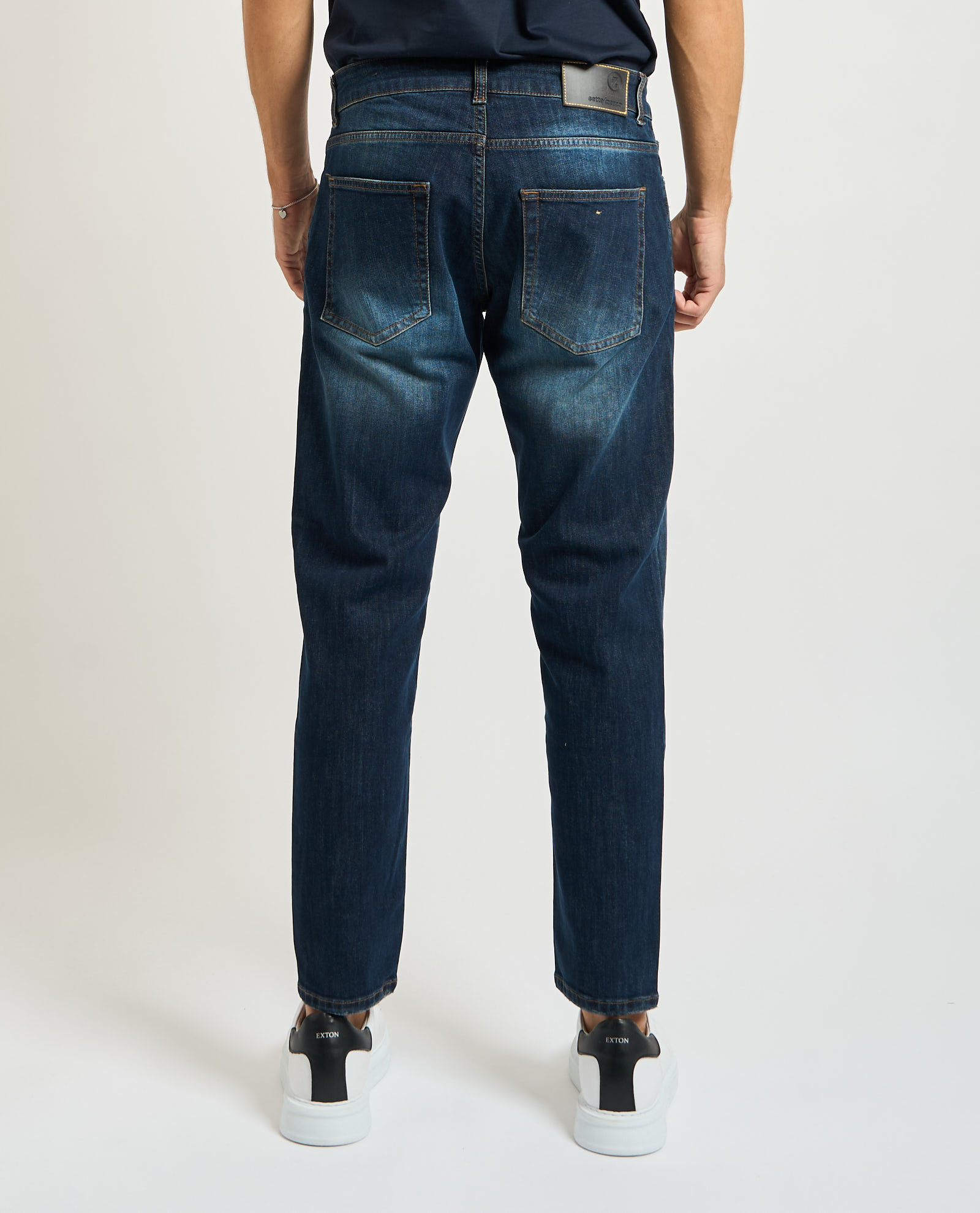 Jeans da uomo firmato Sette/Mezzo in cotone elasticizzato. Lunghezza Capri, 5 tasche, vestibilità slim, lavaggio blu scuro, chiusura con bottone e zip, passanti per cintura. Il modello indossa una 48 ed è alto 1.85m