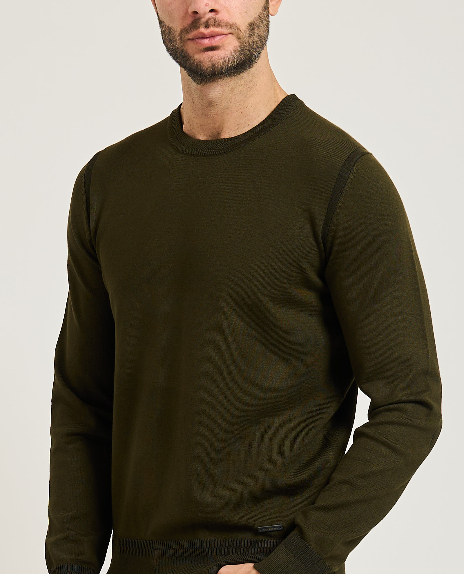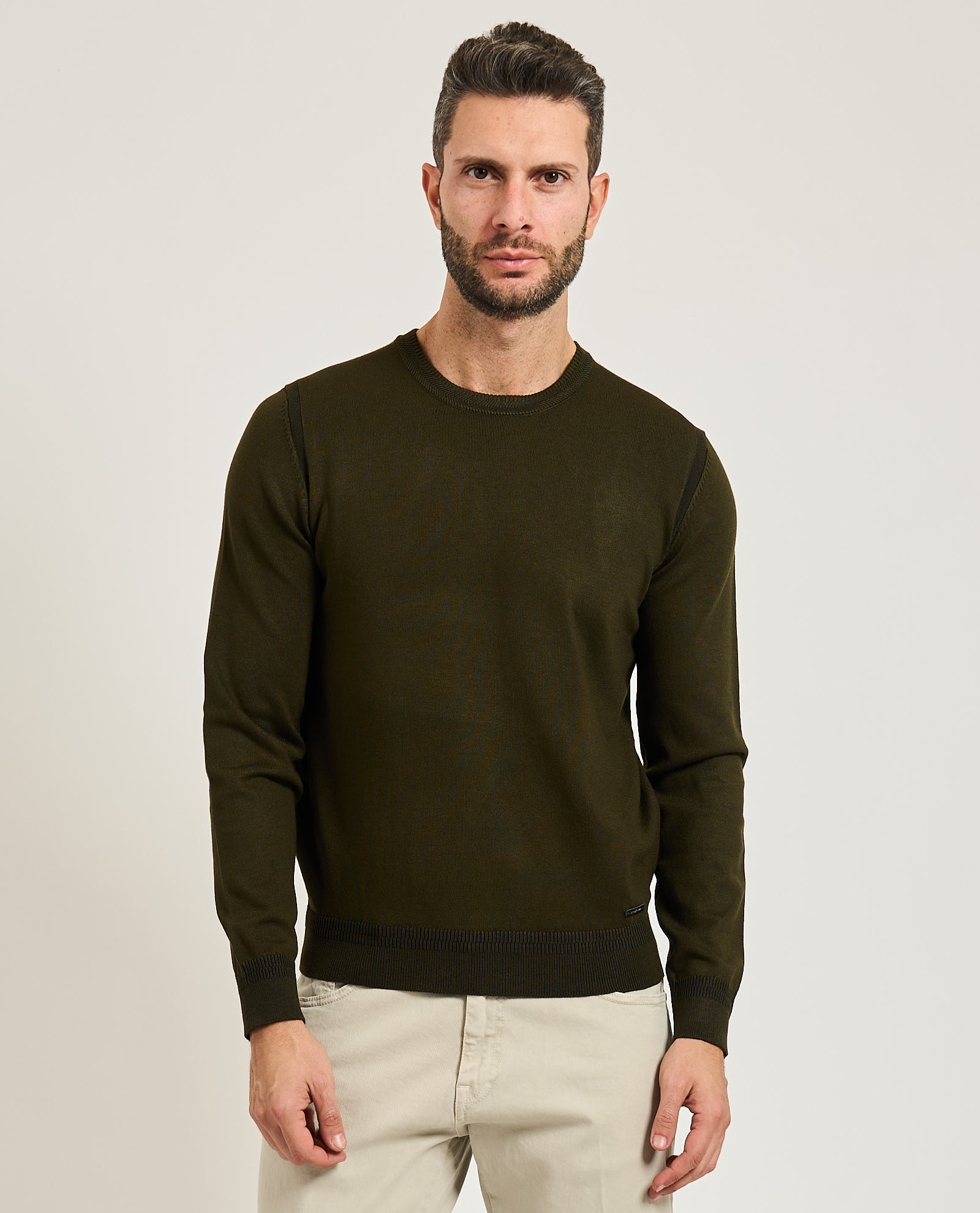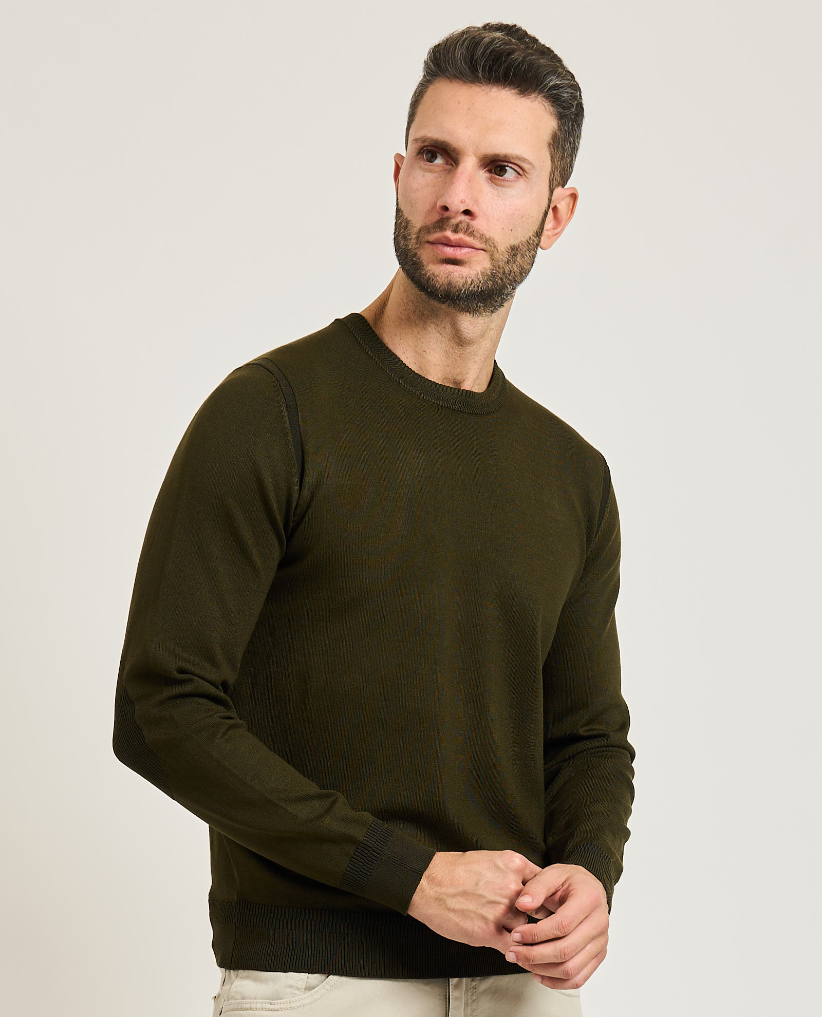 Maglione per uomo firmato Sette/Mezzo in tessuto misto. Girocollo, maniche lunghe, costine e toppe a contrasto. Regular fit. Il modello indossa una M ed è alto 1.85m