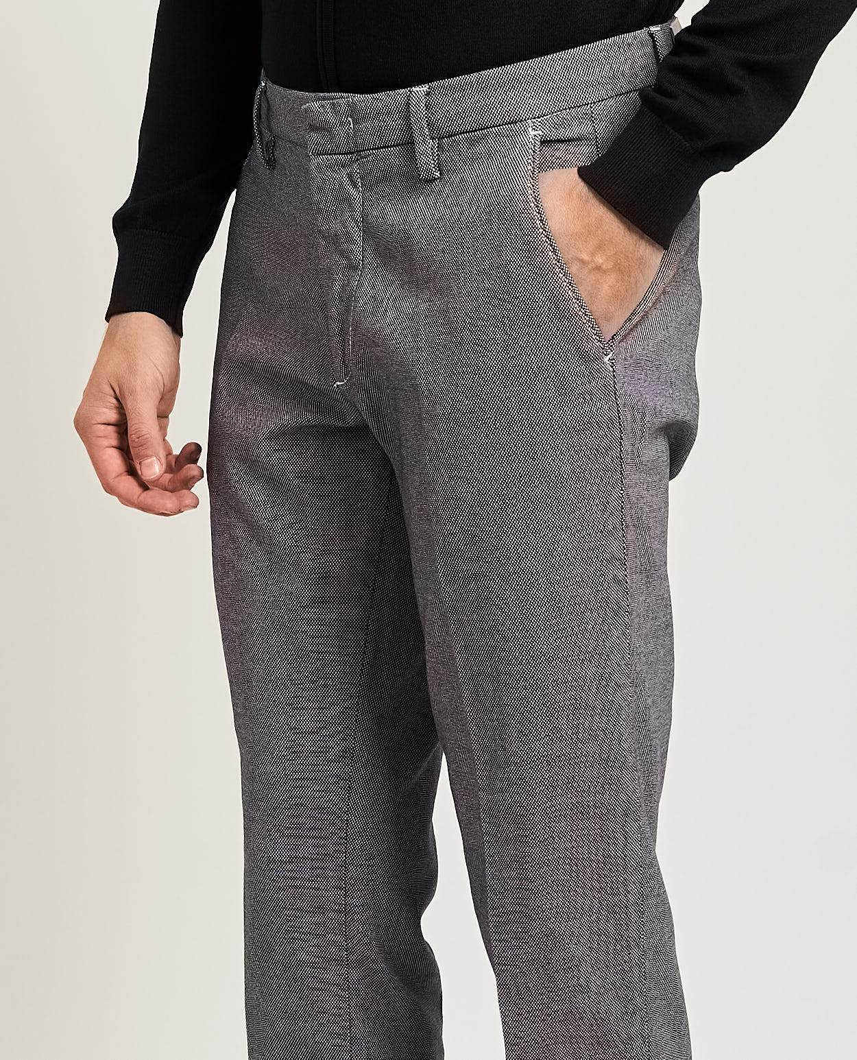 Pantaloni da uomo firmati Sette/mezzo in tessuto misto, effetto impunturato all over, passanti in vita, chiusura a scomparsa, tasche laterali e posteriori a filetto. Il modello indossa la taglia 34 (48 IT) ed è alto 1,85m