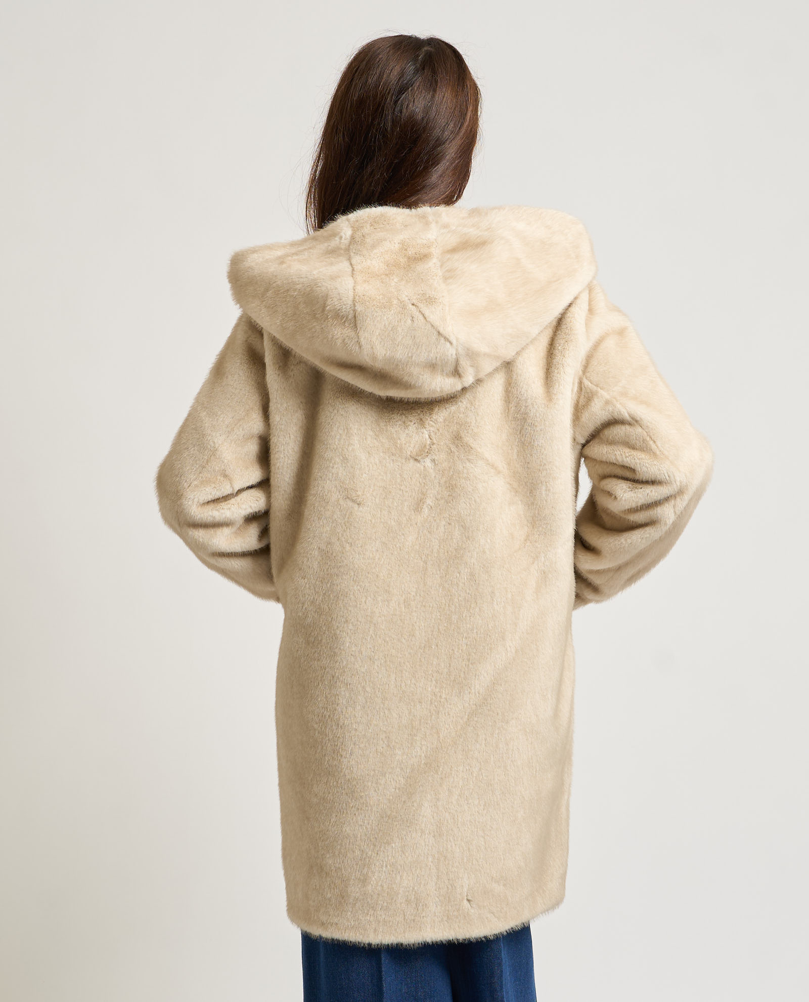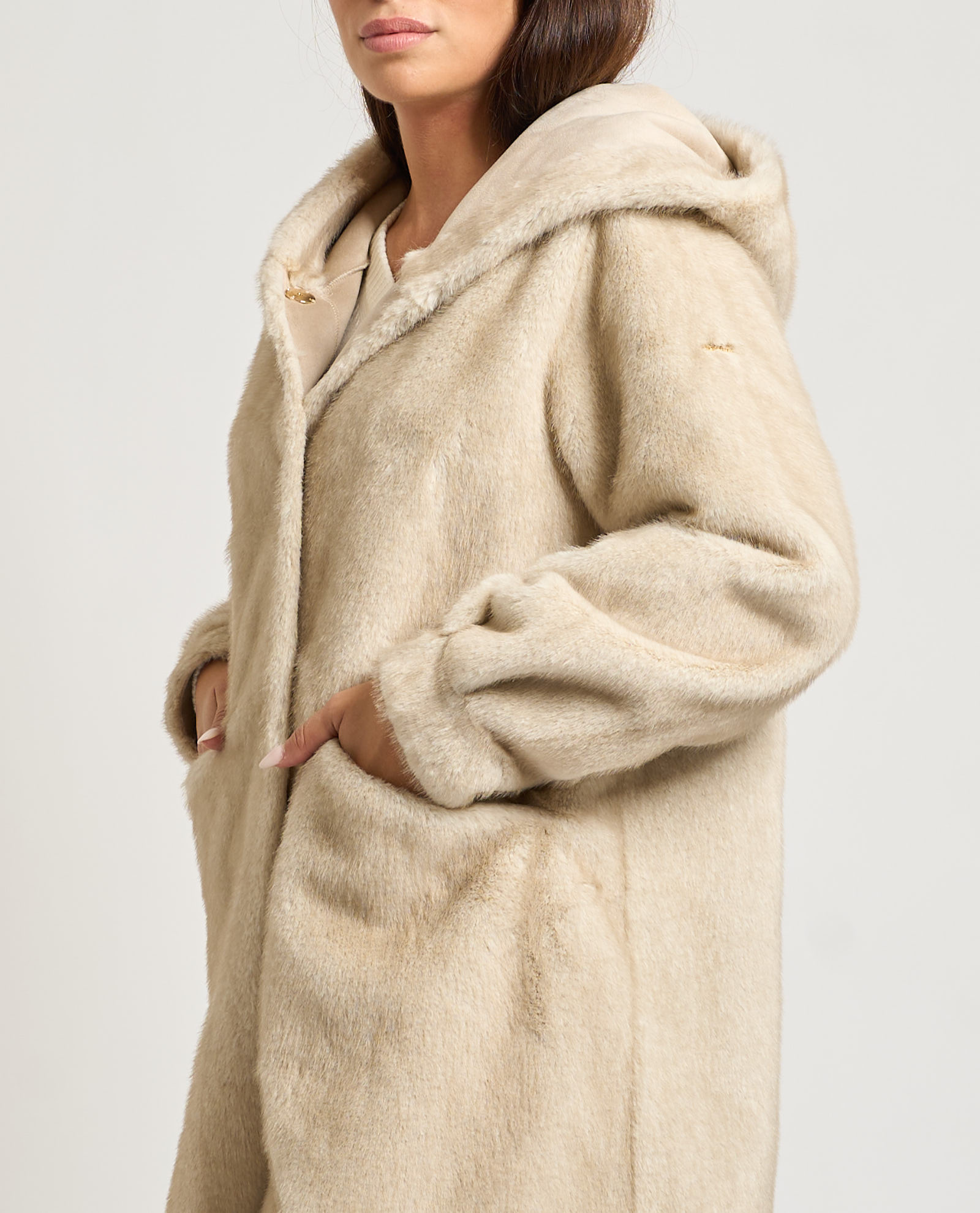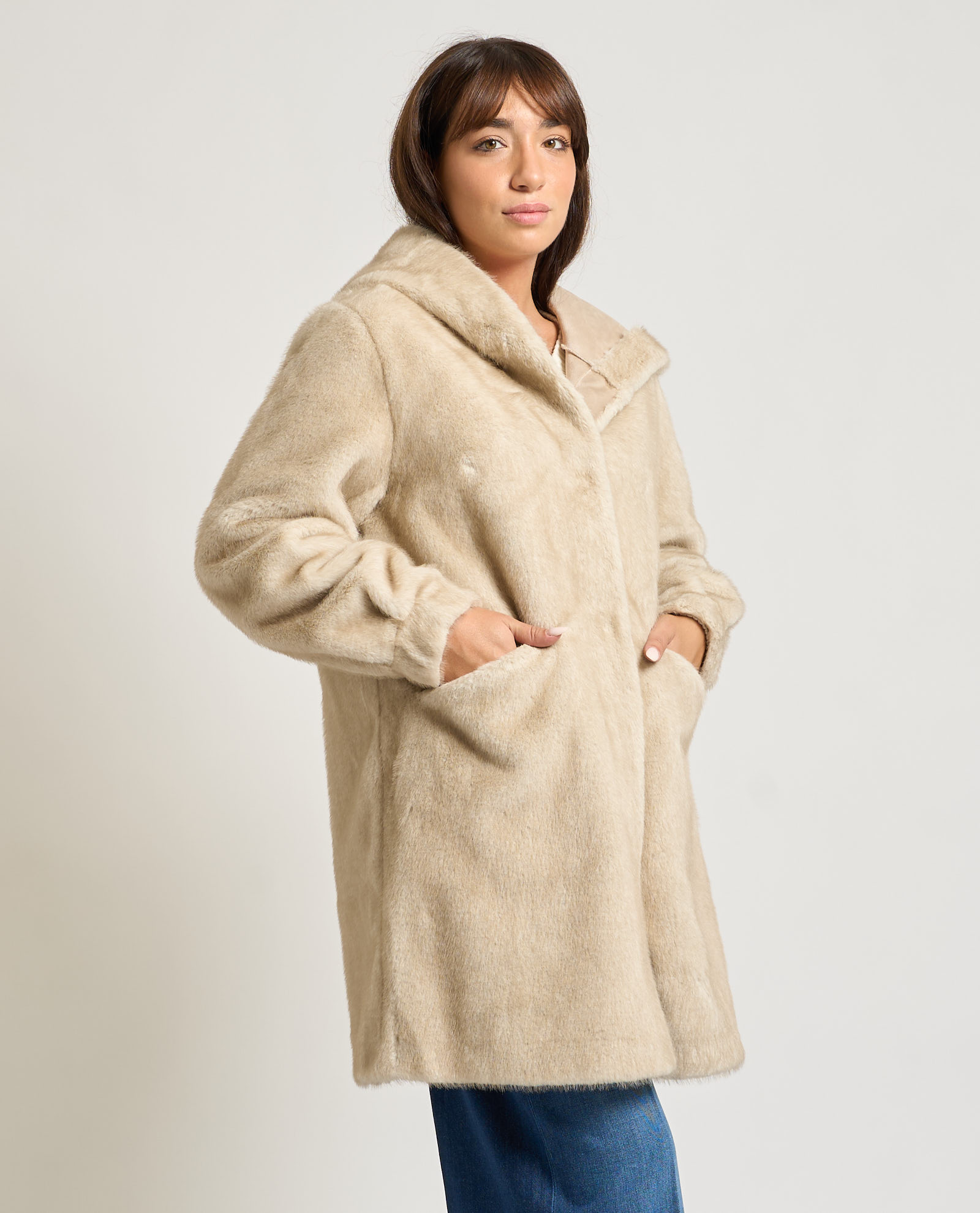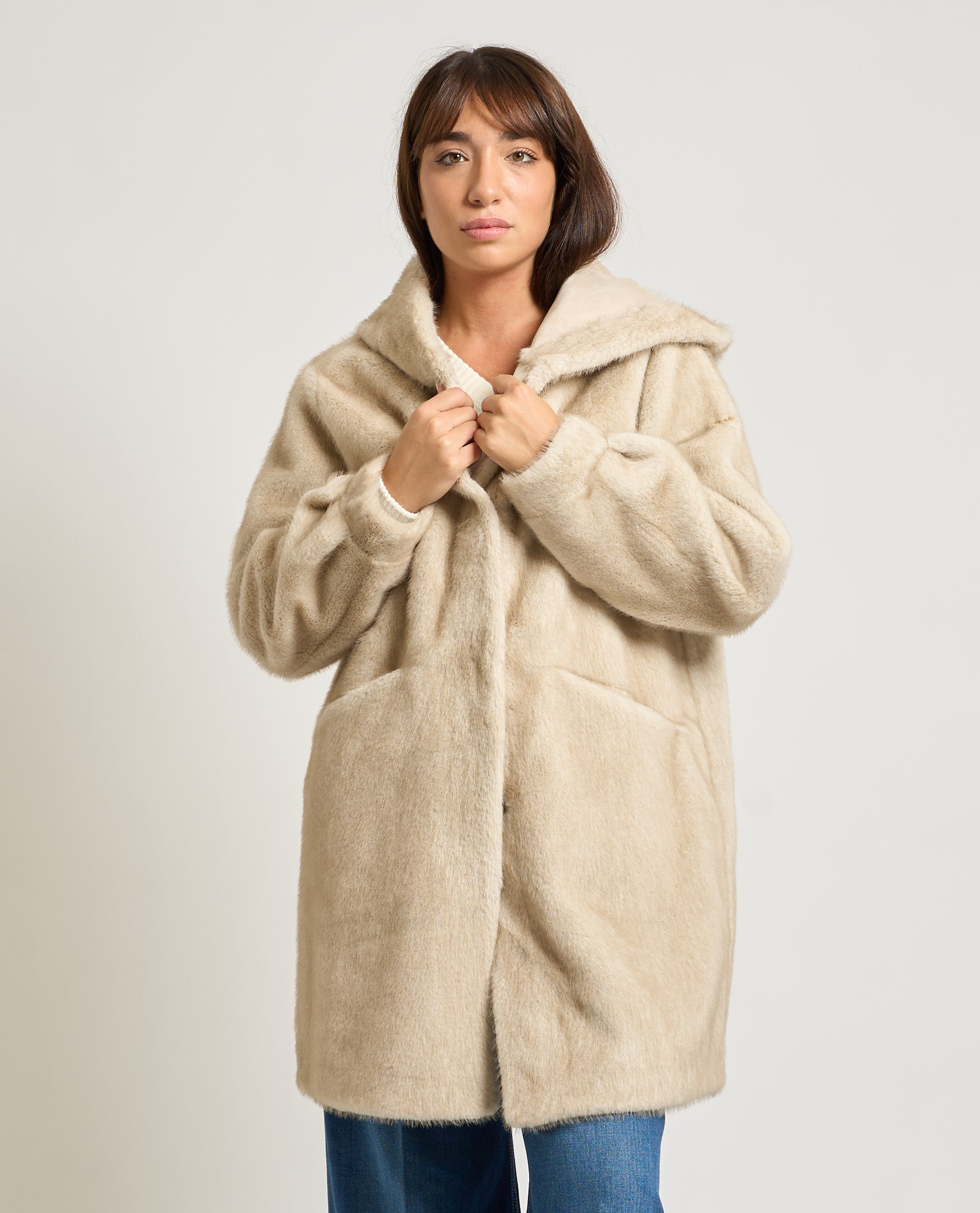 Cappotto donna Yes Zee modello lungo con cappuccio, chiusura con bottoni a pressione e tasche laterali. La modella indossa la taglia S ed è alta 1.65m